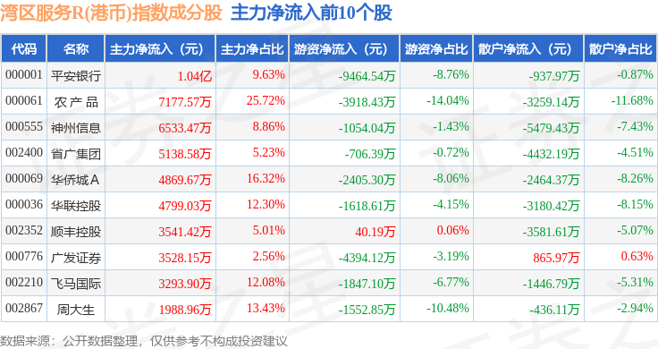 资金流向方面,湾区服务R(港币)(480012)指数成份股当日主力资金净流出合计1.62亿元,游资资金净流出合计1.54亿元,散户资金净流入合计3.16亿元。成份股资金流向详情见下表: