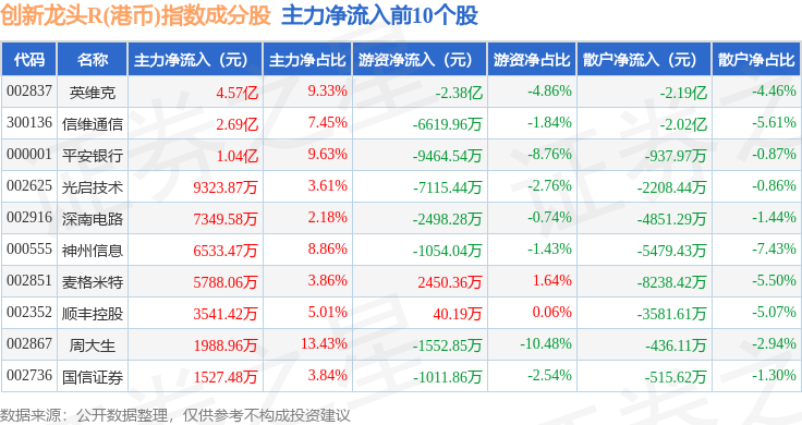 资金流向方面,创新龙头R(港币)(480037)指数成份股当日主力资金净流出合计59.26亿元,游资资金净流入合计10.6亿元,散户资金净流入合计48.65亿元。成份股资金流向详情见下表: