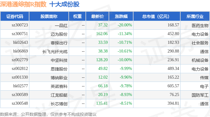 证券之星消息,12月15日,深港通综指R(483005)指数报收于7927.43点,跌1.29%,成交8987.5亿元,换手率1.19%。当日该指数成份股中,上涨的有729家,东方日升以20.02%的涨幅领涨,下跌的有1279家,一品红以20.0%的跌幅领跌。