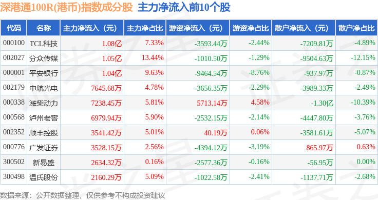 资金流向方面,深港通100R(港币)(483008)指数成份股当日主力资金净流出合计69.38亿元,游资资金净流入合计23.53亿元,散户资金净流入合计45.85亿元。成份股资金流向详情见下表: