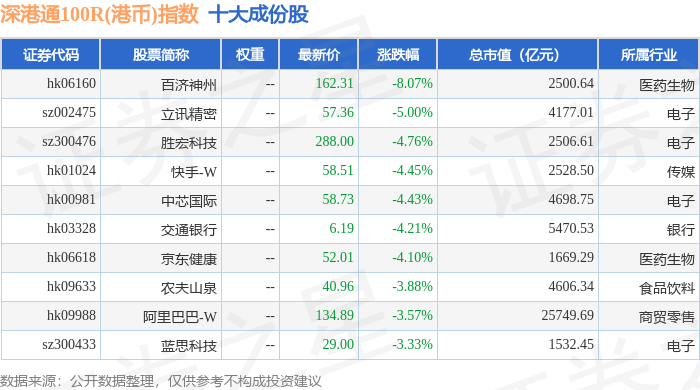 深港通100R(港币)(483008)指数十大成份股详情如下: