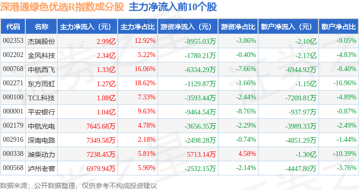 资金流向方面,深港通绿色优选R(483011)指数成份股当日主力资金净流出合计16.45亿元,游资资金净流入合计2.37亿元,散户资金净流入合计14.08亿元。成份股资金流向详情见下表: