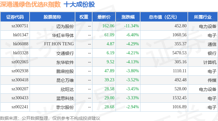 深港通绿色优选R(483011)指数十大成份股详情如下: