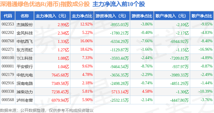 资金流向方面,深港通绿色优选R(港币)(483012)指数成份股当日主力资金净流出合计16.45亿元,游资资金净流入合计2.37亿元,散户资金净流入合计14.08亿元。成份股资金流向详情见下表: