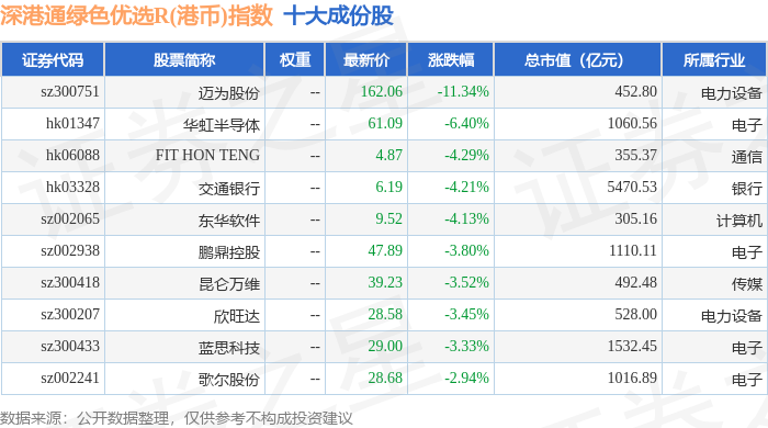 深港通绿色优选R(港币)(483012)指数十大成份股详情如下: