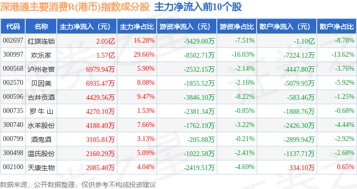 资金流向方面,深港通主要消费R(港币)(483022)指数成份股当日主力资金净流入合计3.89亿元,游资资金净流出合计1.61亿元,散户资金净流出合计2.28亿元。成份股资金流向详情见下表: