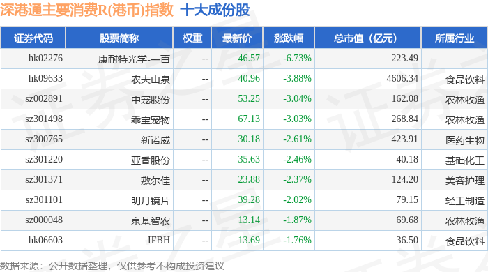 深港通主要消费R(港币)(483022)指数十大成份股详情如下: