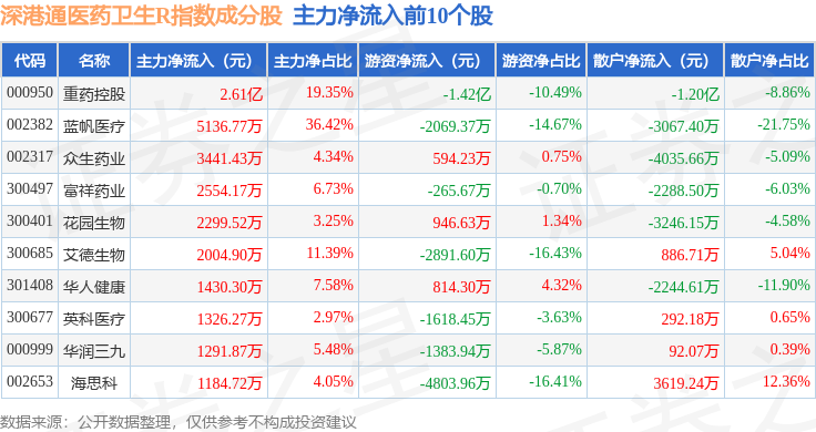 资金流向方面,深港通医药卫生R(483023)指数成份股当日主力资金净流出合计10.89亿元,游资资金净流入合计1853.26万元,散户资金净流入合计10.71亿元。成份股资金流向详情见下表: