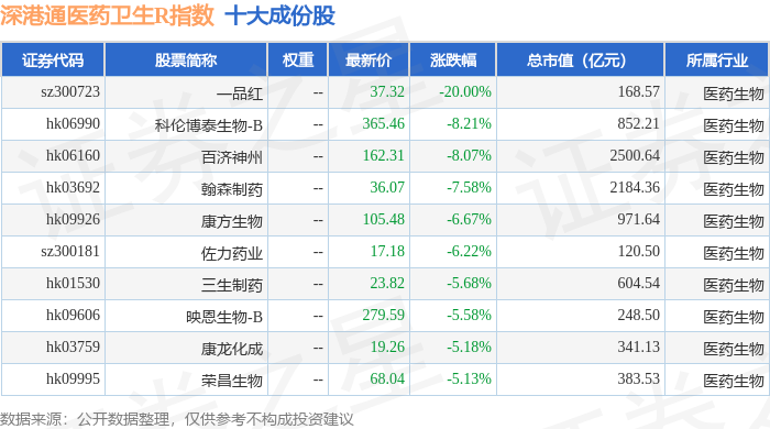 深港通医药卫生R(483023)指数十大成份股详情如下: