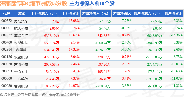 资金流向方面,深港通汽车R(港币)(483040)指数成份股当日主力资金净流出合计4.94亿元,游资资金净流出合计9470.19万元,散户资金净流入合计5.88亿元。成份股资金流向详情见下表: