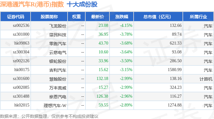深港通汽车R(港币)(483040)指数十大成份股详情如下: