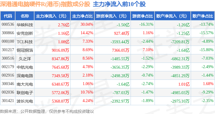资金流向方面,深港通电脑硬件R(港币)(483044)指数成份股当日主力资金净流出合计90.76亿元,游资资金净流入合计16.74亿元,散户资金净流入合计74.02亿元。成份股资金流向详情见下表: