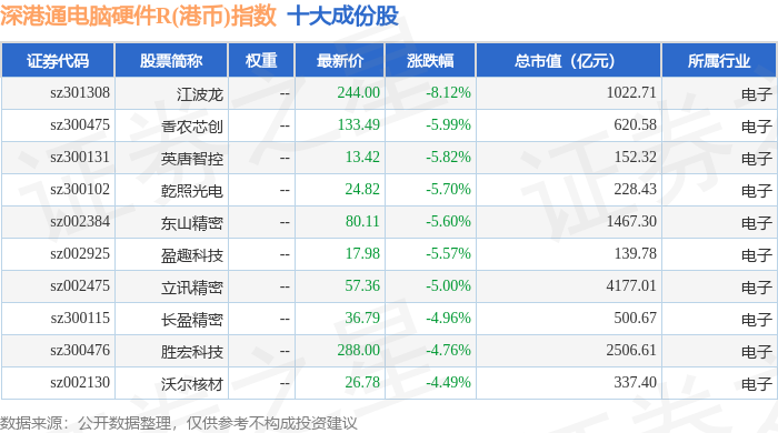 深港通电脑硬件R(港币)(483044)指数十大成份股详情如下: