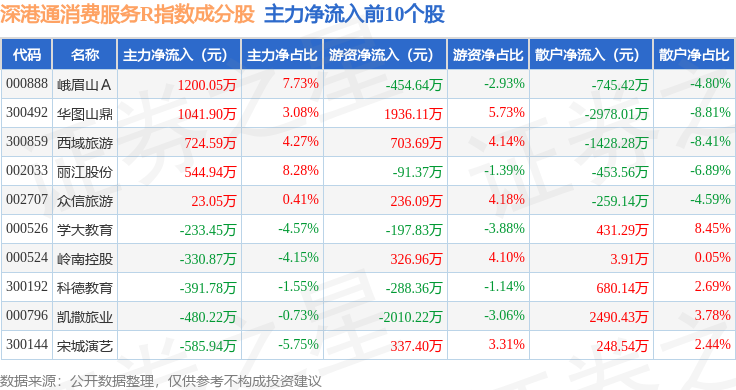 资金流向方面,深港通消费服务R(483045)指数成份股当日主力资金净流出合计1.43亿元,游资资金净流入合计1538.9万元,散户资金净流入合计1.27亿元。成份股资金流向详情见下表: