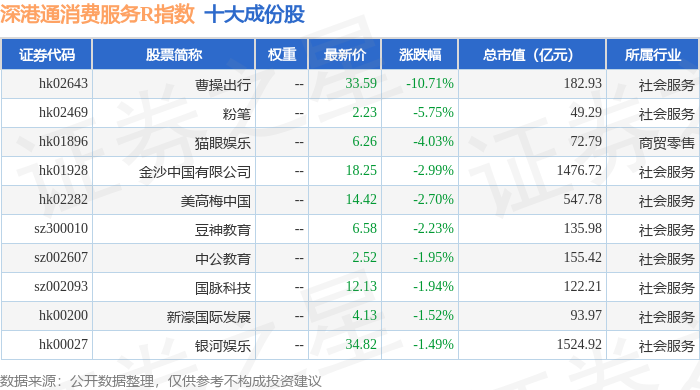 深港通消费服务R(483045)指数十大成份股详情如下: