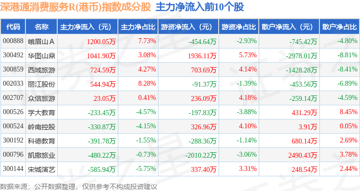 资金流向方面,深港通消费服务R(港币)(483046)指数成份股当日主力资金净流出合计1.43亿元,游资资金净流入合计1538.9万元,散户资金净流入合计1.27亿元。成份股资金流向详情见下表: