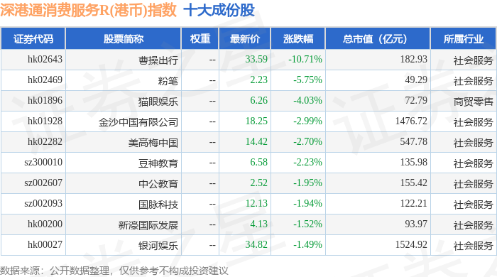 深港通消费服务R(港币)(483046)指数十大成份股详情如下: