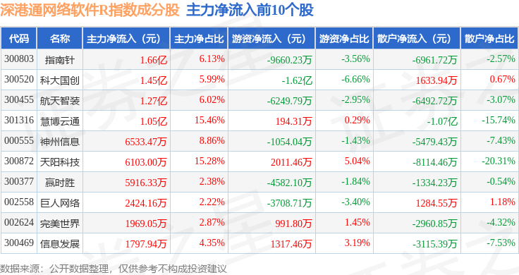 资金流向方面,深港通网络软件R(483047)指数成份股当日主力资金净流出合计19.05亿元,游资资金净流入合计8356.79万元,散户资金净流入合计18.21亿元。成份股资金流向详情见下表: