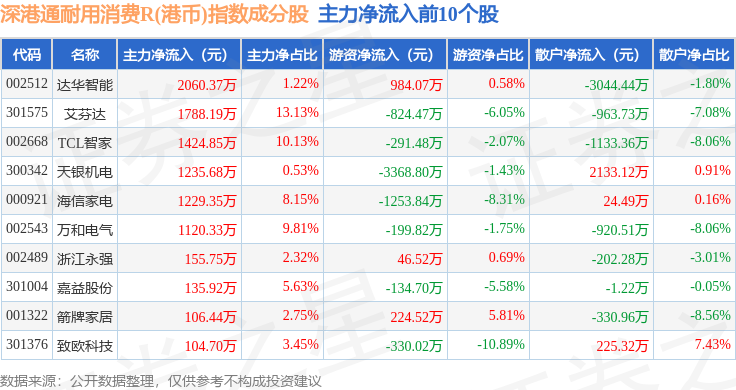 资金流向方面,深港通耐用消费R(港币)(483050)指数成份股当日主力资金净流出合计14.69亿元,游资资金净流入合计4.59亿元,散户资金净流入合计10.1亿元。成份股资金流向详情见下表: