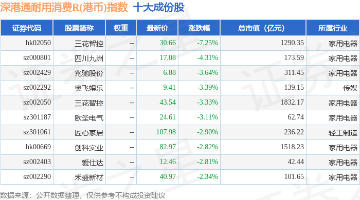 深港通耐用消费R(港币)(483050)指数十大成份股详情如下: