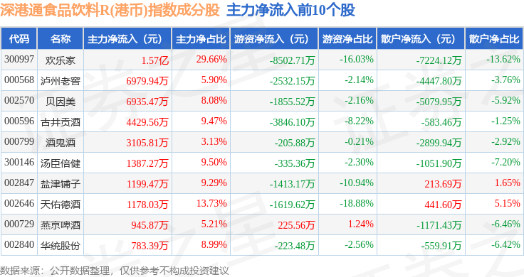 资金流向方面,深港通食品饮料R(港币)(483066)指数成份股当日主力资金净流入合计2.17亿元,游资资金净流出合计1.42亿元,散户资金净流出合计7499.03万元。成份股资金流向详情见下表: