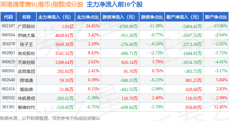 资金流向方面,深港通零售R(港币)(483074)指数成份股当日主力资金净流入合计8311.45万元,游资资金净流出合计6799.79万元,散户资金净流出合计1511.66万元。成份股资金流向详情见下表: