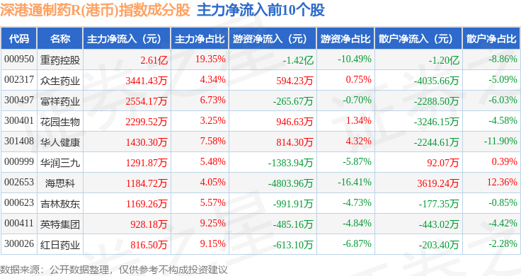 资金流向方面,深港通制药R(港币)(483080)指数成份股当日主力资金净流出合计6.76亿元,游资资金净流入合计7746.95万元,散户资金净流入合计5.98亿元。成份股资金流向详情见下表: