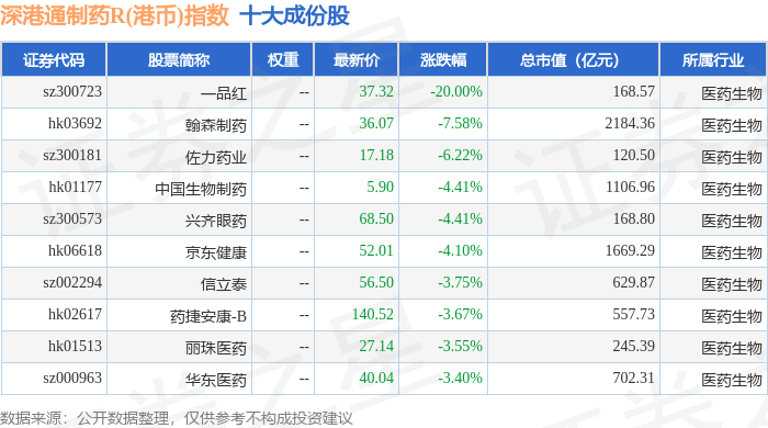 深港通制药R(港币)(483080)指数十大成份股详情如下: