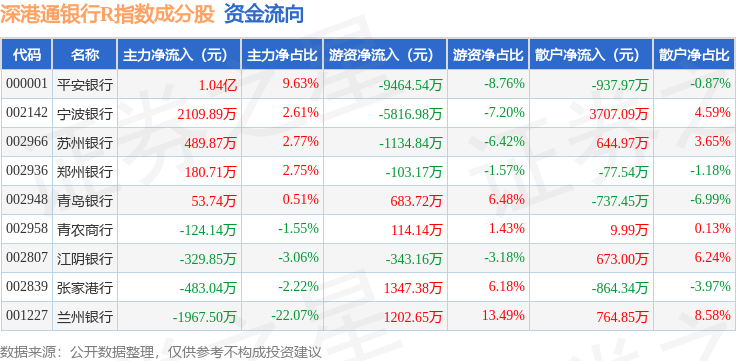 资金流向方面,深港通银行R(483081)指数成份股当日主力资金净流入合计1.03亿元,游资资金净流出合计1.35亿元,散户资金净流入合计3182.6万元。成份股资金流向详情见下表: