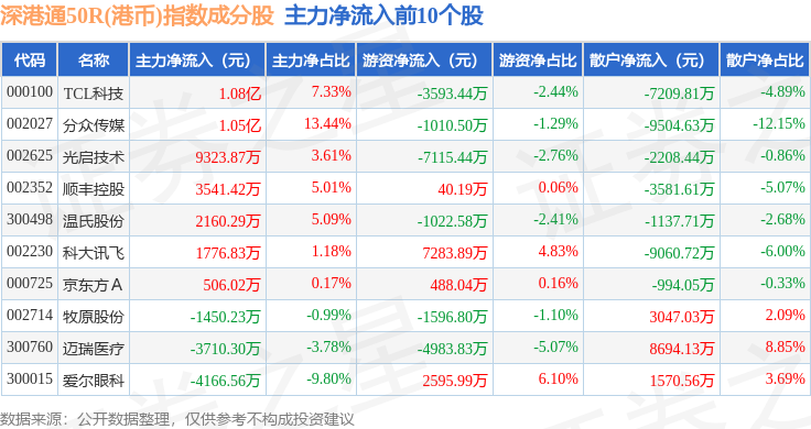 资金流向方面,深港通50R(港币)(483092)指数成份股当日主力资金净流出合计49.49亿元,游资资金净流入合计20.55亿元,散户资金净流入合计28.94亿元。成份股资金流向详情见下表: