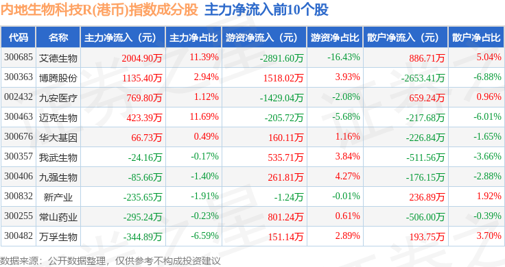 资金流向方面,内地生物科技R(港币)(483102)指数成份股当日主力资金净流出合计3.84亿元,游资资金净流出合计2576.82万元,散户资金净流入合计4.09亿元。成份股资金流向详情见下表:
