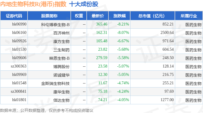 内地生物科技R(港币)(483102)指数十大成份股详情如下: