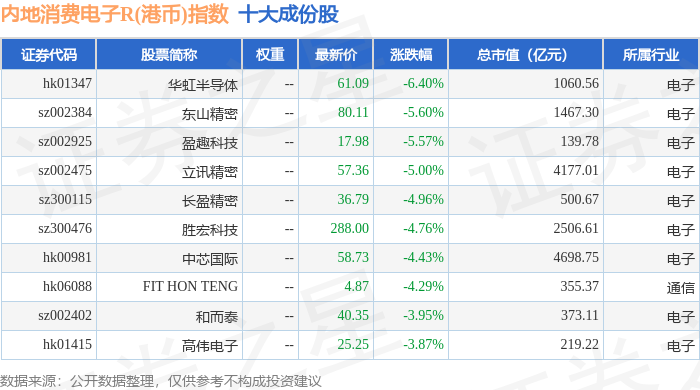 内地消费电子R(港币)(483106)指数十大成份股详情如下: