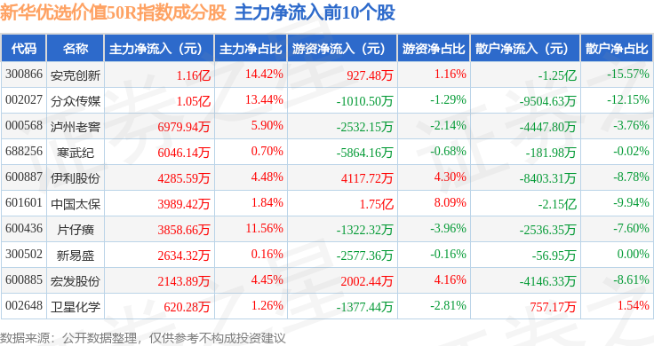 资金流向方面,新华优选价值50R(489004)指数成份股当日主力资金净流出合计86.83亿元,游资资金净流入合计36.98亿元,散户资金净流入合计49.85亿元。成份股资金流向详情见下表: