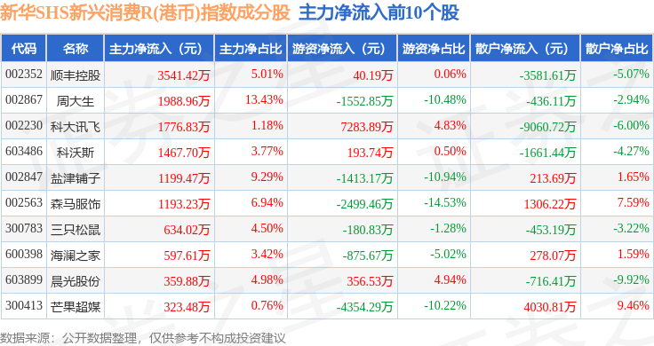 资金流向方面,新华SHS新兴消费R(港币)(489007)指数成份股当日主力资金净流出合计13.71亿元,游资资金净流入合计4.06亿元,散户资金净流入合计9.65亿元。成份股资金流向详情见下表: