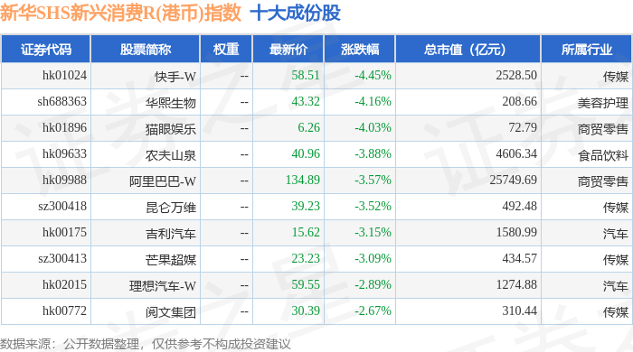 新华SHS新兴消费R(港币)(489007)指数十大成份股详情如下: