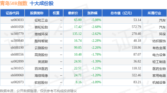 证券之星消息,12月15日,青岛50R(489011)指数报收于2689.32点,跌0.41%,成交75.25亿元,换手率1.43%。当日该指数成份股中,上涨的有22家,冠中生态以14.68%的涨幅领涨,下跌的有18家,征和工业以5.08%的跌幅领跌。