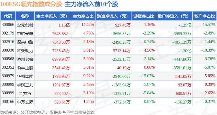 资金流向方面,100ESG领先(970030)指数成份股当日主力资金净流出合计75.2亿元,游资资金净流入合计21.97亿元,散户资金净流入合计53.24亿元。成份股资金流向详情见下表: