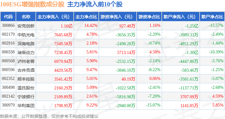资金流向方面,100ESG增强(970033)指数成份股当日主力资金净流出合计60.94亿元,游资资金净流入合计20.44亿元,散户资金净流入合计40.5亿元。成份股资金流向详情见下表: