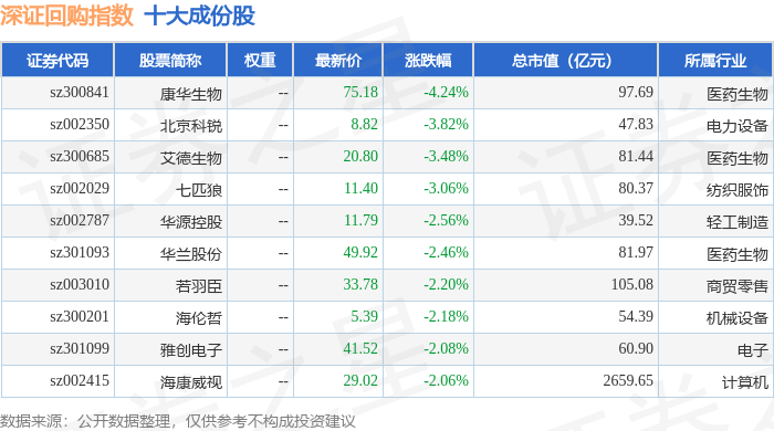 深证回购(970063)指数十大成份股详情如下: