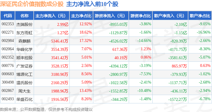 资金流向方面,深证民企价值(970072)指数成份股当日主力资金净流出合计12.19亿元,游资资金净流出合计1.02亿元,散户资金净流入合计13.21亿元。成份股资金流向详情见下表: