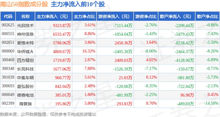 资金流向方面,南山50(980023)指数成份股当日主力资金净流出合计22.15亿元,游资资金净流入合计2.05亿元,散户资金净流入合计20.09亿元。成份股资金流向详情见下表: