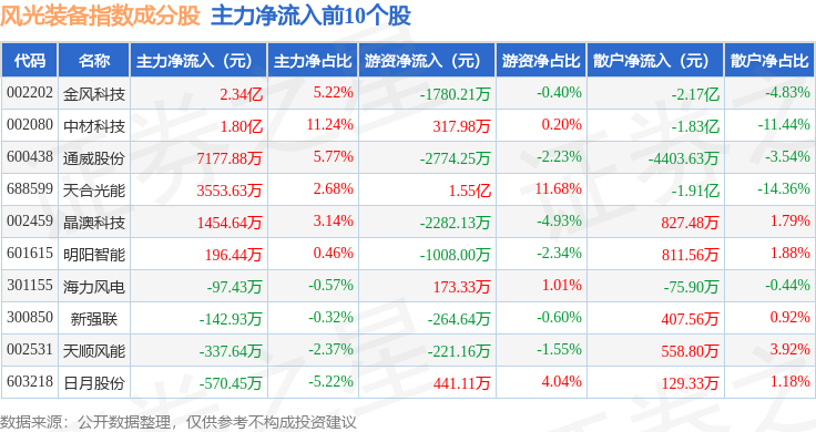 资金流向方面,风光装备(980026)指数成份股当日主力资金净流出合计27.97亿元,游资资金净流入合计7.57亿元,散户资金净流入合计20.4亿元。成份股资金流向详情见下表: