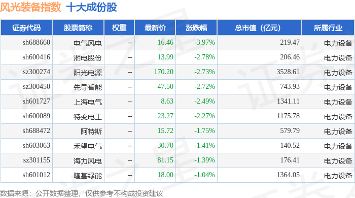 风光装备(980026)指数十大成份股详情如下: