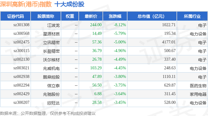 深圳高新(港币)(980039)指数十大成份股详情如下: