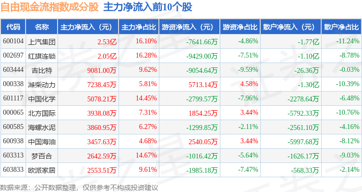 资金流向方面,自由现金流(980092)指数成份股当日主力资金净流出合计14.38亿元,游资资金净流入合计3.61亿元,散户资金净流入合计10.77亿元。成份股资金流向详情见下表: