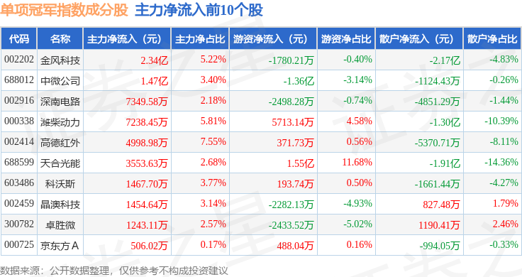 资金流向方面,单项冠军(980150)指数成份股当日主力资金净流出合计51.03亿元,游资资金净流入合计12.44亿元,散户资金净流入合计38.6亿元。成份股资金流向详情见下表: