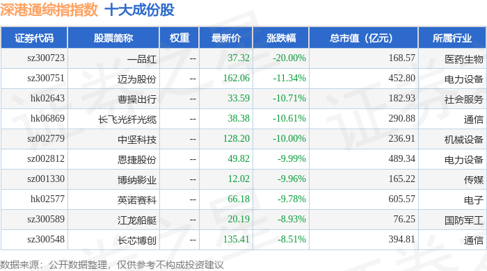 证券之星消息,12月15日,深港通综指(983005)指数报收于6331.96点,跌1.29%,成交8987.5亿元,换手率1.19%。当日该指数成份股中,上涨的有729家,东方日升以20.02%的涨幅领涨,下跌的有1279家,一品红以20.0%的跌幅领跌。