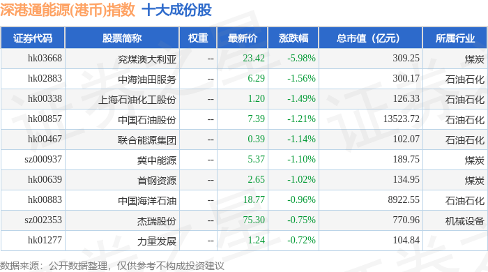 深港通能源(港币)(983014)指数十大成份股详情如下: