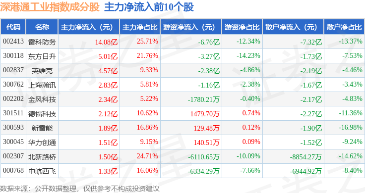 资金流向方面,深港通工业(983017)指数成份股当日主力资金净流出合计28.6亿元,游资资金净流出合计5.56亿元,散户资金净流入合计34.16亿元。成份股资金流向详情见下表: